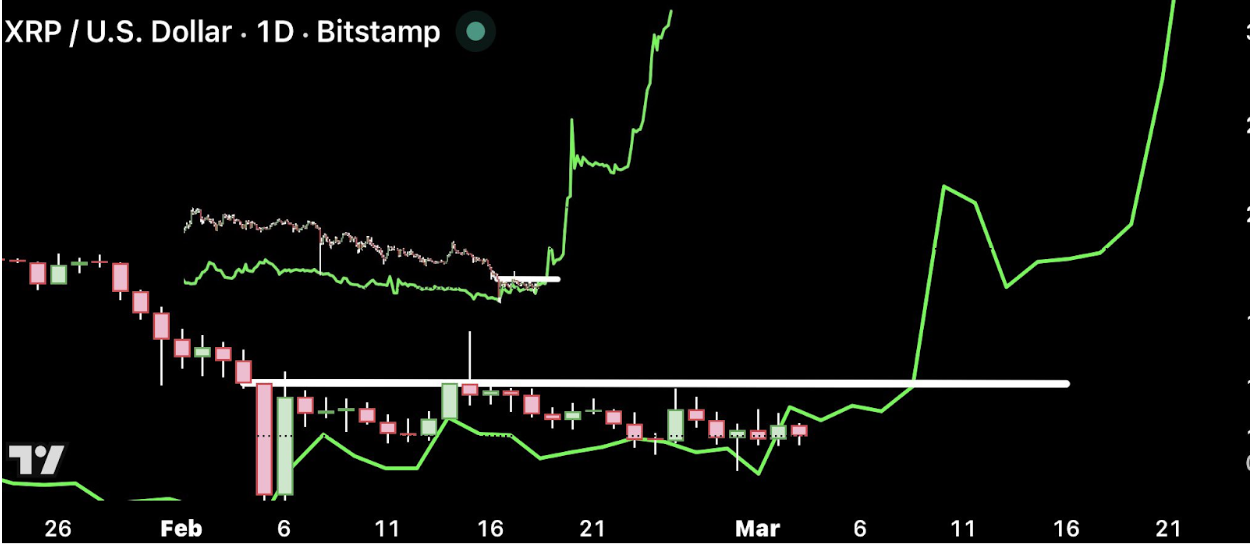 The chart attached to that post shows XRP moving through a flat, compressed range under a horizontal resistance zone on the daily candlestick chart, with the green fractal path projecting a rally once that resistance is broken.
