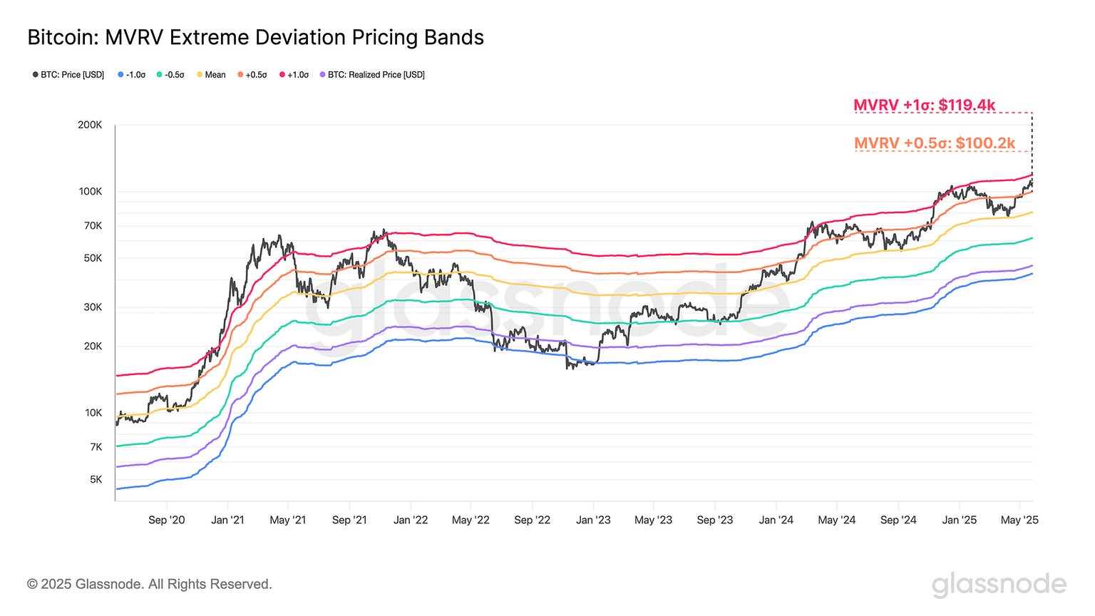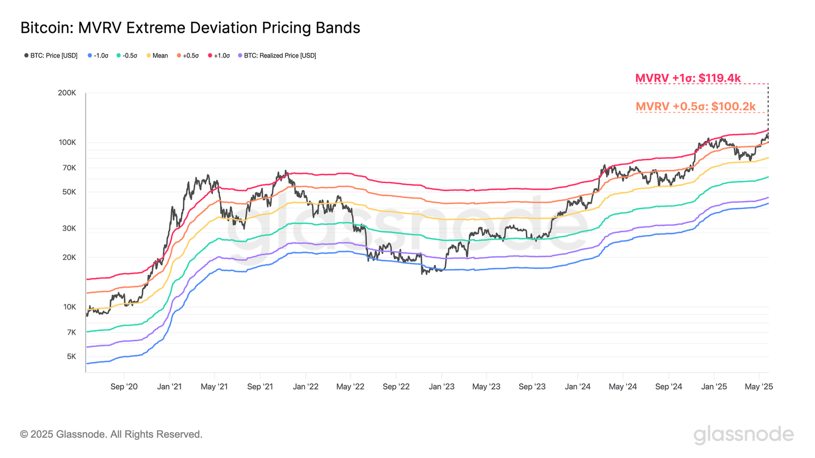 This line corresponds to the worth at which the MVRV Ratio attains a price that’s 0.5 customary deviations above the all-time imply. At current, the extent is located round $100,200.