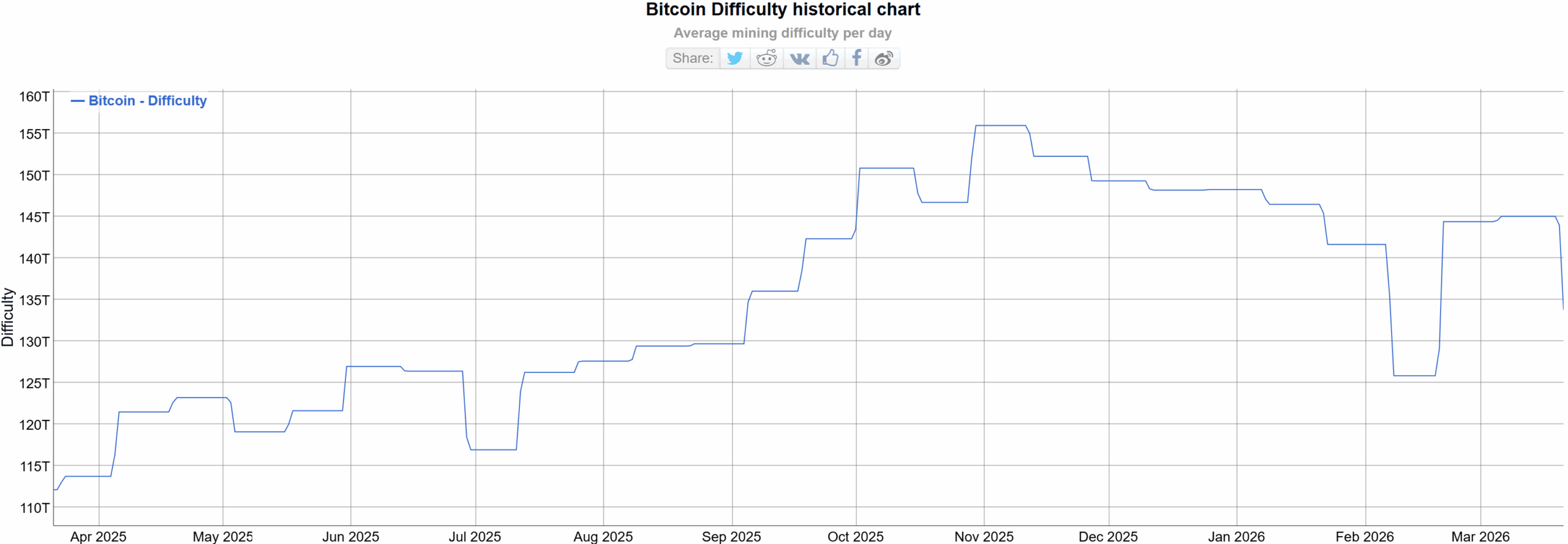 On-chain data now suggests that the next adjustment should take place on April 3, and current estimations show that the metric might increase slightly to almost 135T from 133.79T now. The difficulty peaked in late October 2025 at 155T, which means that the number now is over 13% lower.