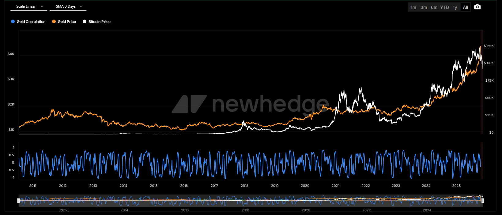 Bitcoin and gold correlation. Supply: Newhedge.
