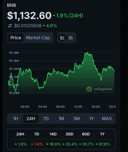 In keeping with studies, BNB confirmed uncommon power throughout a current market tumble that worn out practically $20 billion in liquidations on the peak. The token barely budged at first — slipping roughly 2-3% throughout the early shock — and later traded above $1,130, gaining over 10% in 24 hours as patrons returned.