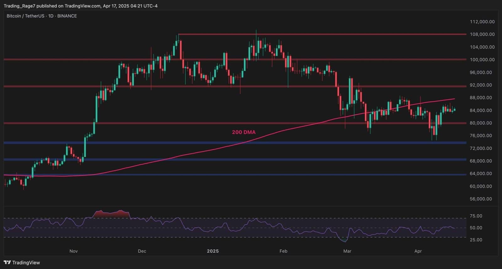 On the day by day chart, BTC is holding slightly below the 200-day transferring common, situated round $88K, after its mid-March dip towards $74,000. Value motion stays trapped between $80K help and the 200-day transferring common, forming a compression vary.