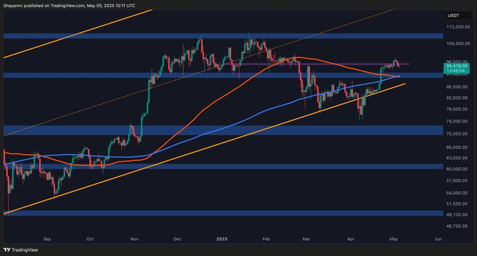 Bitcoin continues to commerce just under the $96K resistance, consolidating after its sharp rally in late April. The value is at present hovering in a slender vary whereas the market digests latest beneficial properties.