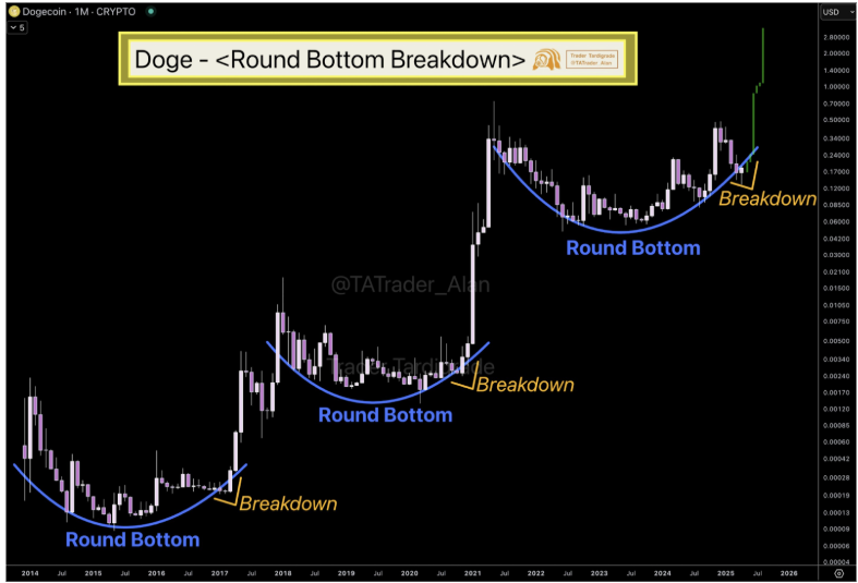 Nonetheless, $0.25 is just the goal within the brief time period. In a separate analysis, Dealer Tardigrade pointed to Dogecoin’s long-term chart, highlighting a spherical backside formation. The accompanying chart reveals that in earlier cycles, Dogecoin’s worth shaped a rounded backside earlier than getting into explosive upward tendencies. This repeated sample, now seen once more on the month-to-month timeframe, indicators that Dogecoin could also be on the verge of one other vital breakout. The long-term price target on this case is $2.8.