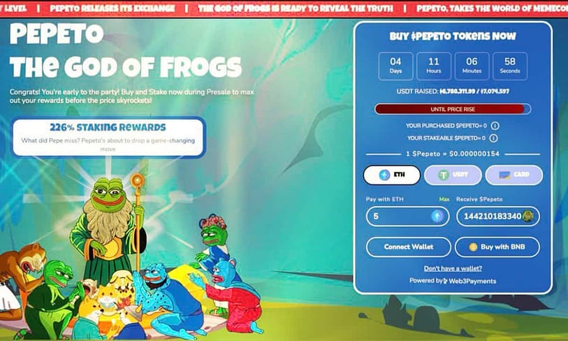 In the course of the presale levels, the value of Pepeto will increase step by step. Every new stage brings a barely increased value per token, making earlier entries extra cost-efficient. This construction is designed to determine development forward of any public itemizing. As well as, staking rewards are presently marketed at 226% APY, provided as a part of the undertaking’s holding mechanism.