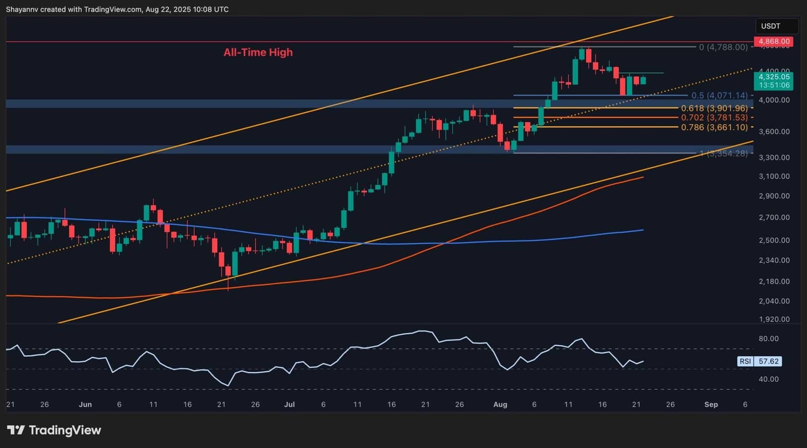 The value motion has since developed a short-term consolidation vary between $4,200 and $4,400, resembling an inverted head and shoulders sample. This displays market indecision: patrons are actively defending assist, but battle to reclaim resistance.