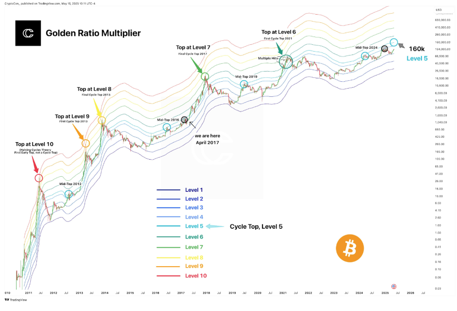 The chart accompanying CryptoCon’s put up paints a well-recognized image with the Golden Multiplier Ratio. Every band, starting from Degree 1 to Degree 10, relies on a multiplier stage derived from the 350-day transferring common. Bitcoin has topped at numerous ranges: Degree 10 in 2011, Degree 9 and eight in 2013, Degree 7 in 2017, and Degree 6 in 2021. The present cycle’s peak ought to most certainly be Degree 5, however the Bitcoin price is yet to get there.
