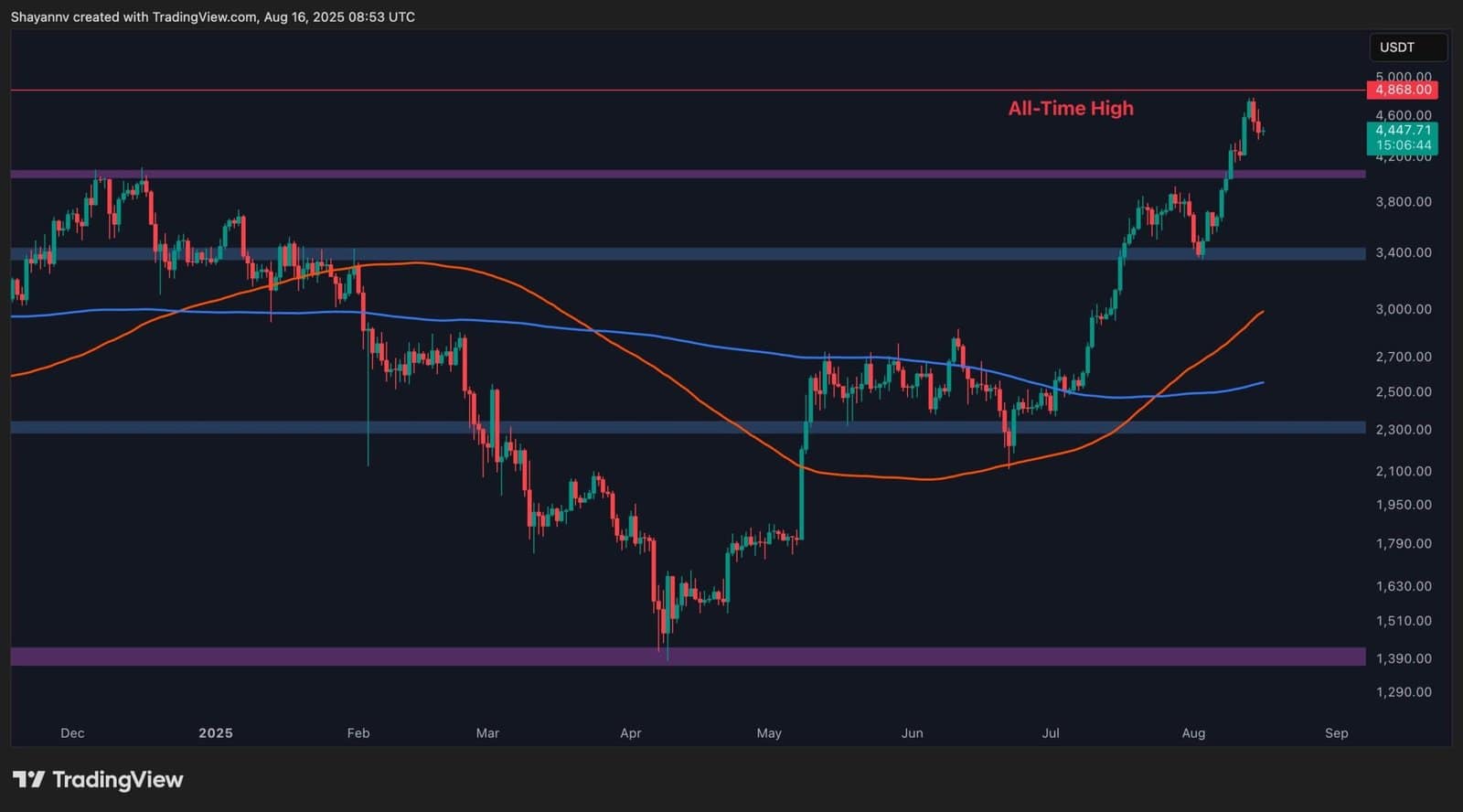 At present, ETH seems to be consolidating throughout the $4.2K–$4.8K vary, which now serves as a important resolution zone. A breakout above the higher boundary would doubtless gas a powerful continuation rally, concentrating on the psychological $5K milestone. Conversely, continued sideways motion would reinforce the vary because the battleground for the following main transfer.
