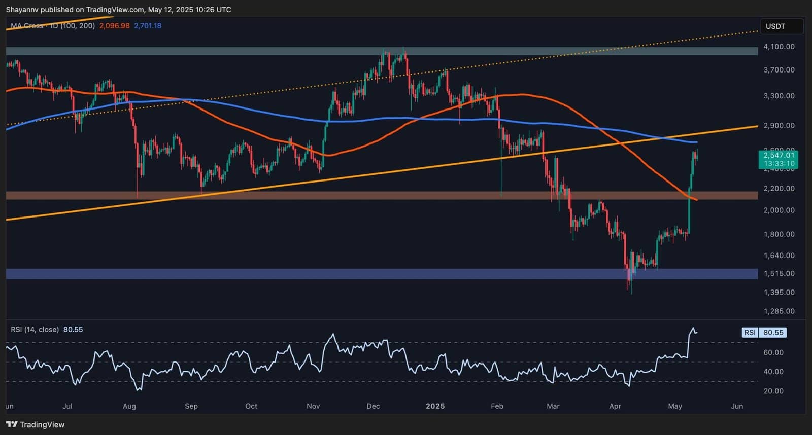 On the decrease timeframe, Ethereum’s aggressive shopping for momentum has pushed the value by means of a number of resistance ranges. This rally indicators the consumers’ intention to focus on all-time highs within the coming months. Nevertheless, ETH has now reached a key provide zone of round $2.6K, which corresponds with a significant swing excessive in March. This space has already capped the rally, suggesting a possible short-term pause or consolidation.