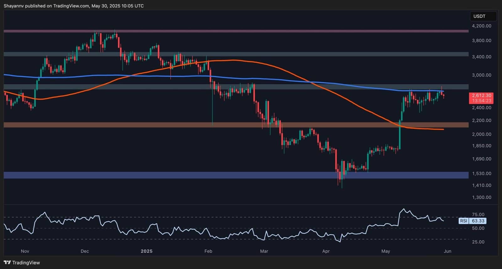 Ethereum is at the moment consolidating beneath the most important resistance at $2,800, which aligns with the 200-day shifting common. The uptrend that started close to $1,500 has paused, and the RSI has barely dropped beneath 70, reflecting weakening bullish momentum.