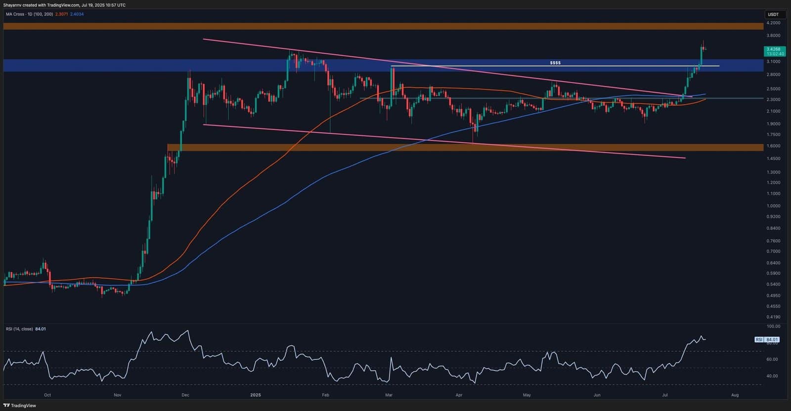 The transfer was clear and impulsive, with the value now pushing towards the $4.00 psychological resistance degree. That is the subsequent main mark to observe, as it’s possible a possible goal for a lot of patrons. The RSI can be sitting above 80, exhibiting robust momentum, but in addition flashing warning for potential short-term overextension.