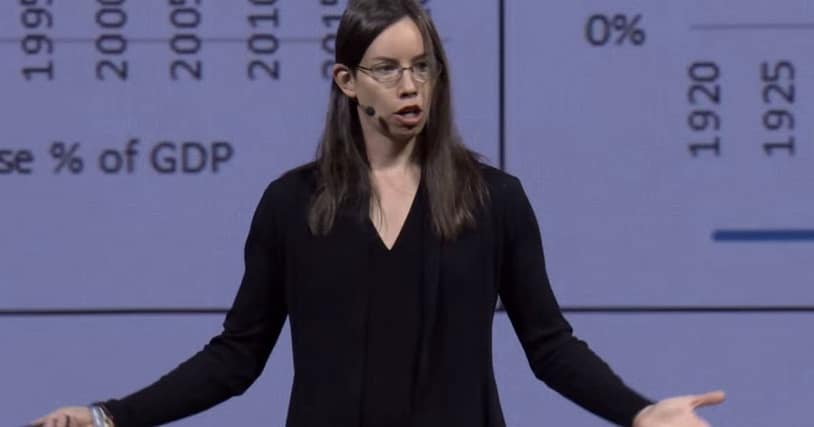 Her slide confirmed a relentless rise in whole debt versus base cash—aside from a jolt in 2008, and once more after 2020. “This isn’t going backward. Ever.”