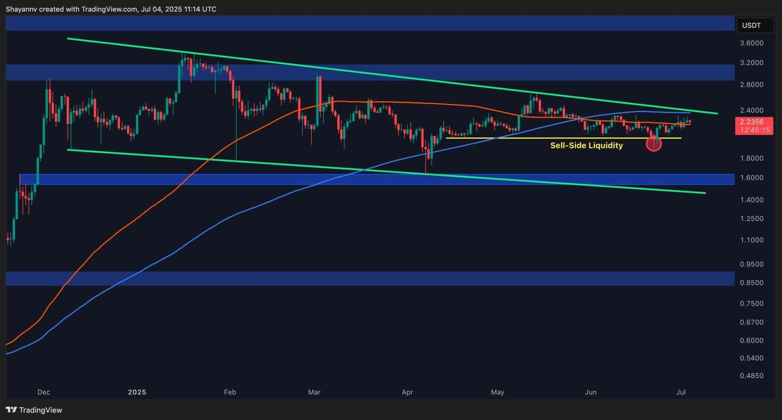 Regardless of a number of makes an attempt to push greater, it has failed to interrupt and shut above this confluence. Till that occurs, the downtrend construction stays intact, and the wedge continues to be in play.