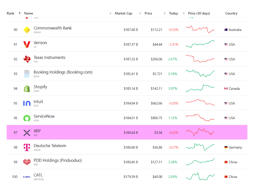 Crossing into the ranks of the world’s prime 100 property reveals how XRP is faring in comparison with corporations outdoors the cryptocurrency market. At its present valuation, XRP is now on the tails of among the most acknowledged world companies, like Verizon, Texas Devices, Shopify, and Intuit.