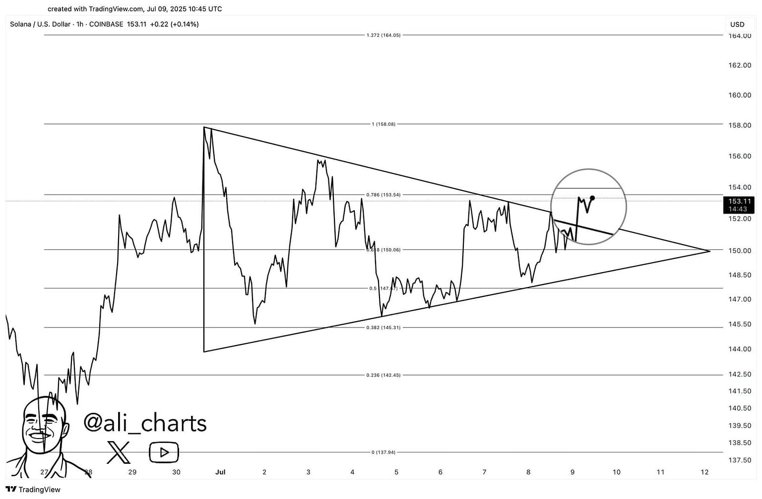In a brand new post on X, analyst Ali Martinez has talked about how Solana has simply damaged a resistance line. The extent in query is a part of a Symmetrical Triangle, a sample from technical analysis (TA).