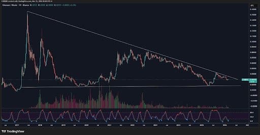 Price action in the chart shows that ETH/BTC hit this peak during the 2021 bull market but failed to break the upper descending trendline of the converging pattern. Following this, the pair dropped back sharply and has continued to trend lower, now pressing into the very tip of the convergence pattern near the 0.029 level.
