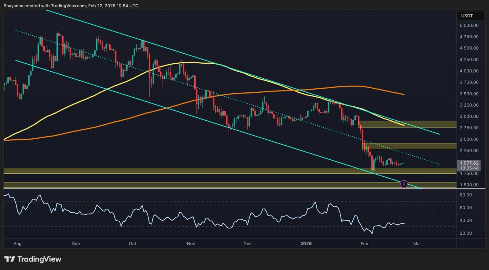 Ethereum stays in a broader corrective section, buying and selling under key transferring averages and inside a well-defined descending construction. Whereas short-term stabilization is seen close to help, the higher-timeframe pattern nonetheless favors sellers until main resistance ranges are reclaimed with sturdy momentum.