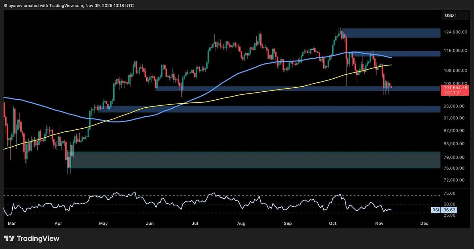 The RSI can be sitting close to 36, displaying that the market is approaching oversold territory, however not fairly there but. There’s a danger of continuation decrease if the patrons fail to defend this zone, with the subsequent main help sitting round $95K. Total, the every day construction seems to be heavy, and restoration above the $108K–$110K zone is required to flip the outlook again to bullish.