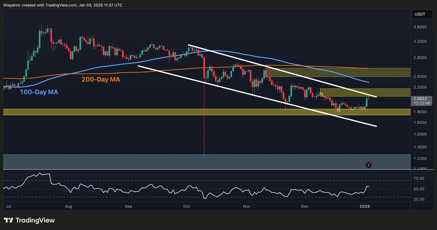 On the every day chart, XRPUSDT is buying and selling round $2.00 after bouncing from the $1.8 assist zone. The value remains to be inside a descending channel, however in the present day’s every day candle is testing the higher trendline.