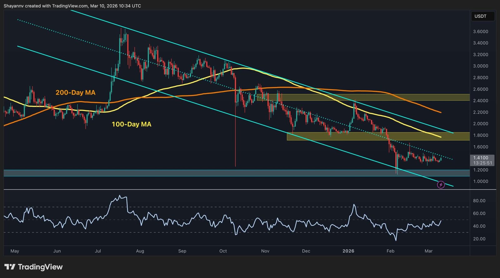 On the XRP/USDT chart, the asset is still moving inside a broad descending channel, which keeps the daily structure bearish. XRP is trading around $1.41 and remains below both the 100-day and 200-day moving averages, while the dotted trendline and the $1.80 zone continue to cap rebounds.