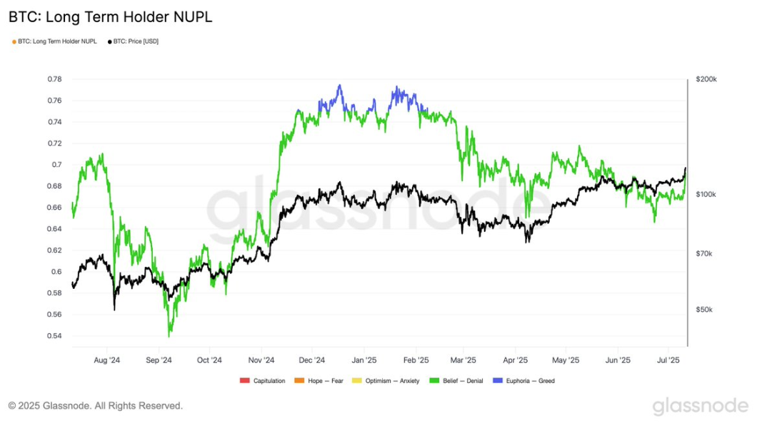 In line with the Lengthy-Time period Holder Web Unrealized Revenue and Loss (NUPL) metric from Glassnode, Bitcoin’s present stage of long-term profitability sentiment is at 0.69. That is notably under the 0.75 mark related to euphoric market circumstances, regardless of Bitcoin having simply printed a brand new all-time excessive.