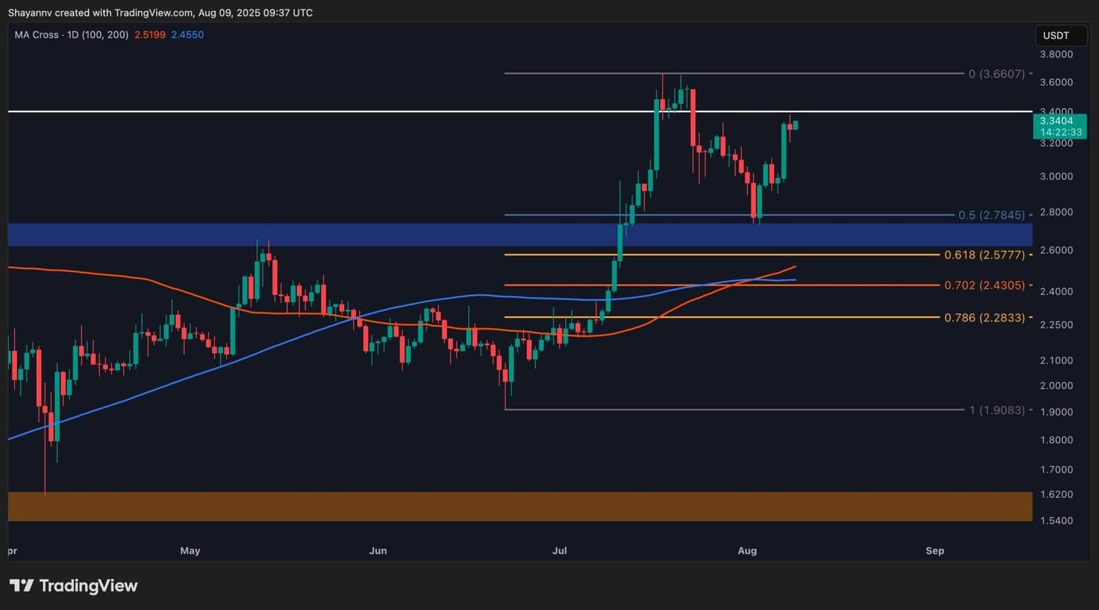 This confluence attracted notable shopping for curiosity, triggering a pointy upswing towards the $3.4–$3.6 resistance vary. This zone represents a previous swing excessive and a possible space of concentrated provide, making it a big hurdle for consumers to clear.