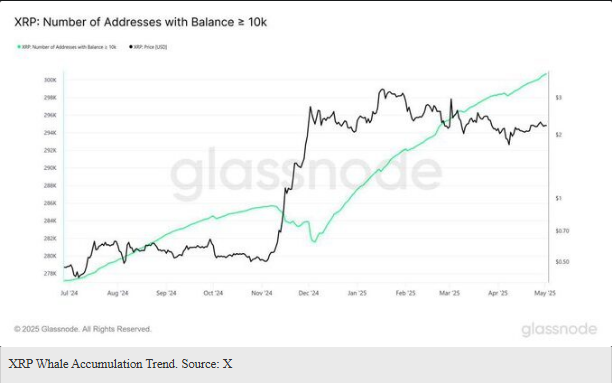 In the meantime, as XRP’s value stays stagnant, the big holders are filling up. In keeping with latest statistics, there are actually greater than 300,000 addresses holding a minimal of 10,000 XRP. That’s a rise from round 281,000 as of December 2024. Whale wallets proceed to rise regardless that the value stays largely flat round $2.20.