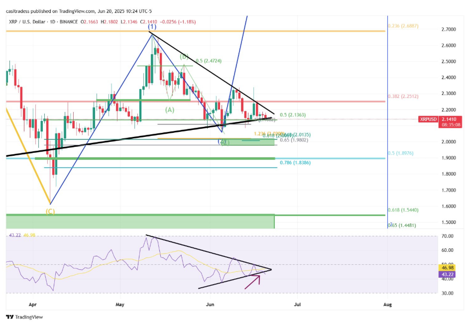 After weeks of lower highs and higher lows, XRP’s day by day candlestick value chart is now giving a sign that would dictate the subsequent main transfer. Though the token remains to be holding above key horizontal ranges close to $2.13, technical information suggests momentum is beginning to slip. A technical evaluation of XRP’s day by day RSI indicator presents a clue into what comes subsequent, and it’s not necessarily bullish within the quick time period.