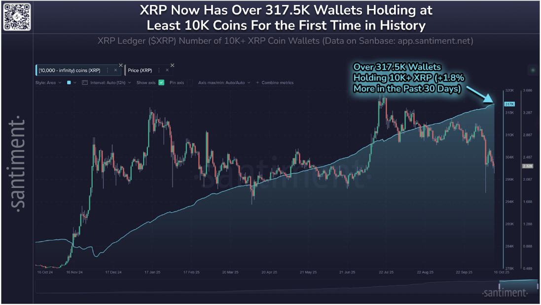 XRP has proven some signs of recovery over the previous 48 hours, climbing about 5.3 % from its latest low, in line with on-chain analytics platform Santiment. The rebound comes as investor confidence seems to be returning, because it coincides with a gradual rise in mid to large-sized XRP holders. Notably, on-chain knowledge exhibits that the XRP ecosystem now has greater than 317,500 wallets holding at the least 10,000 XRP tokens for the primary time in its historical past.