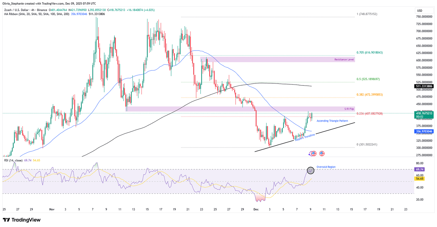 Zcash (ZEC) is buying and selling at round $418 after rising 13% within the final 24 hours. Over the previous week, the value is up by 24%.